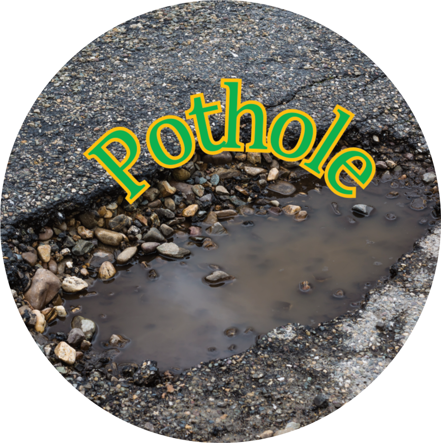 There are 40 round cards that are Potholes or Patches. They can be played on a turn to block an opponent or to repair a pothole and open a street. The images below are from the beta test version of Pothole!